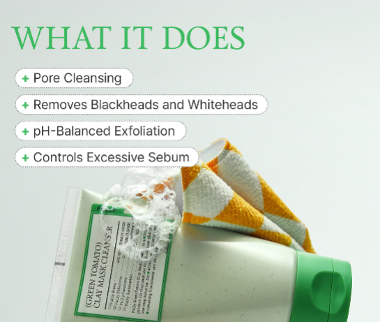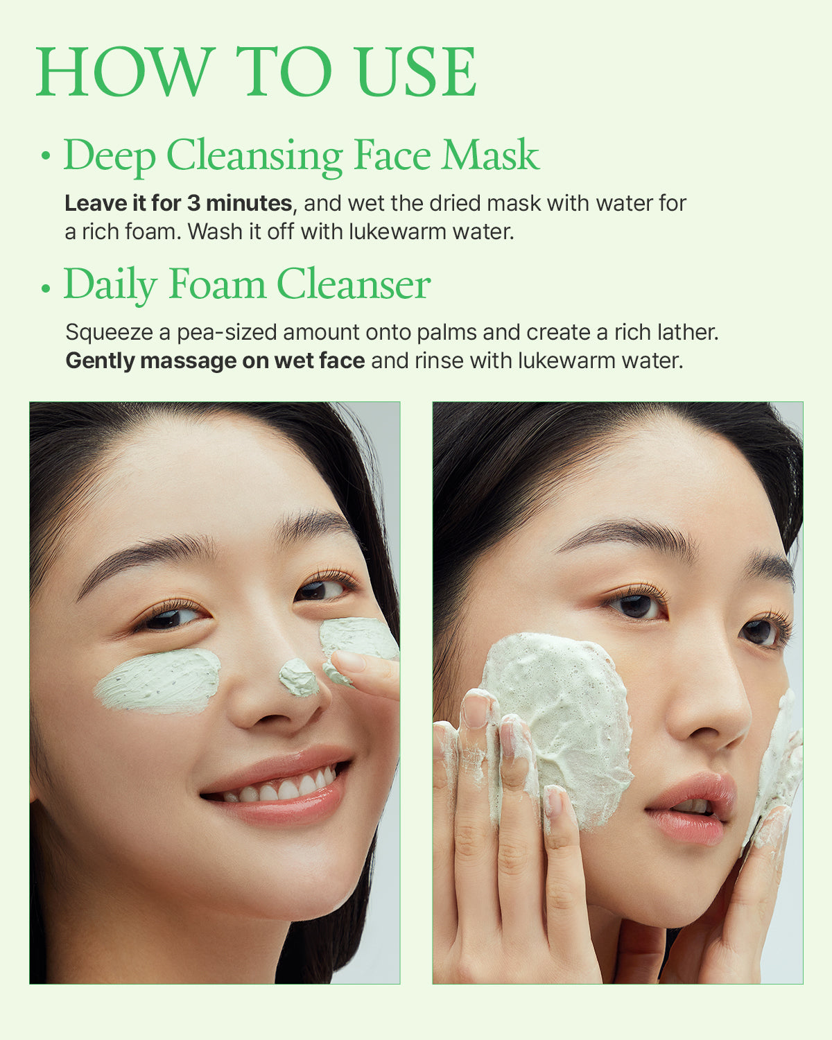 Inhaltsstoffe: Solanum Lycopersicum (Tomaten) Fruchtextrakt, Myristinsäure, Glycerin, Bentonit, Kaolin, Kaliumhydroxid, Laurinsäure, Titandioxid, Zea Mays (Mais) Stärke, Palmitinsäure, Butylenglykol, Stearinsäure, Coco-Glucosid, 1,2-Hexandiol, Centella Asiatica Extrakt, Ficus Carica (Feigen) Fruchtextrakt, Oenothera Biennis (Nachtkerze) Blumenextrakt, Ulmus Davidiana Wurzextrakt, Pinus Palustris Blattextrakt, Pueraria Lobata Wurzel Extrakt, Hydriertes Lecithin, Magnesium Aluminium Silikat, Wasser, Mentha Arvensis Pulver, Hydroxyacetophenon, Glyceryl Stearate, Dipropylenglykol, Ethylhexylglycerin, Decylenglykol, Natrium Cocoyl Glycinate, Natrium Phytat, Beta-Glucan, Ceramid NP, Montmorillonit, Illit, Kanadisches Kolloidales Ton, Hektorit, Chromoxid Grün.