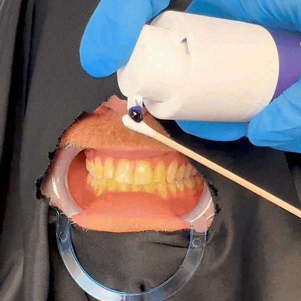 V34 ist am effektivsten bei natürlichen Zähnen. Es kann sicher bei Zahnersatz verwendet werden, aber die Farbkorrektur wirkt nur bei natürlichem Zahnmaterial.